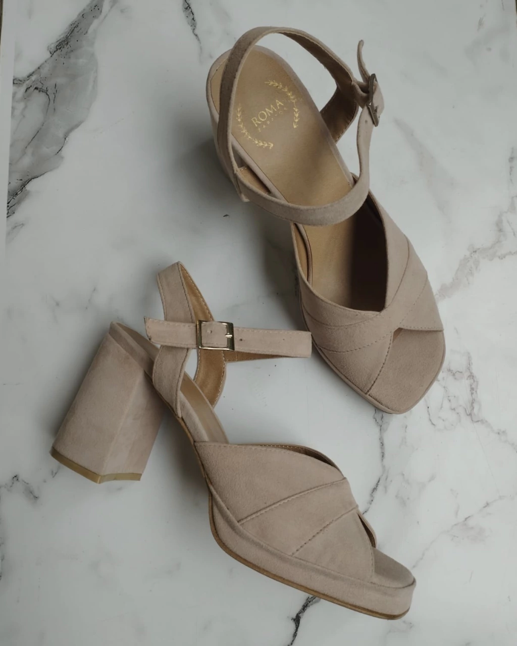 Sandalia de aproximadamente 8 cm de altura, confeccionada en Gamuza Rosa.