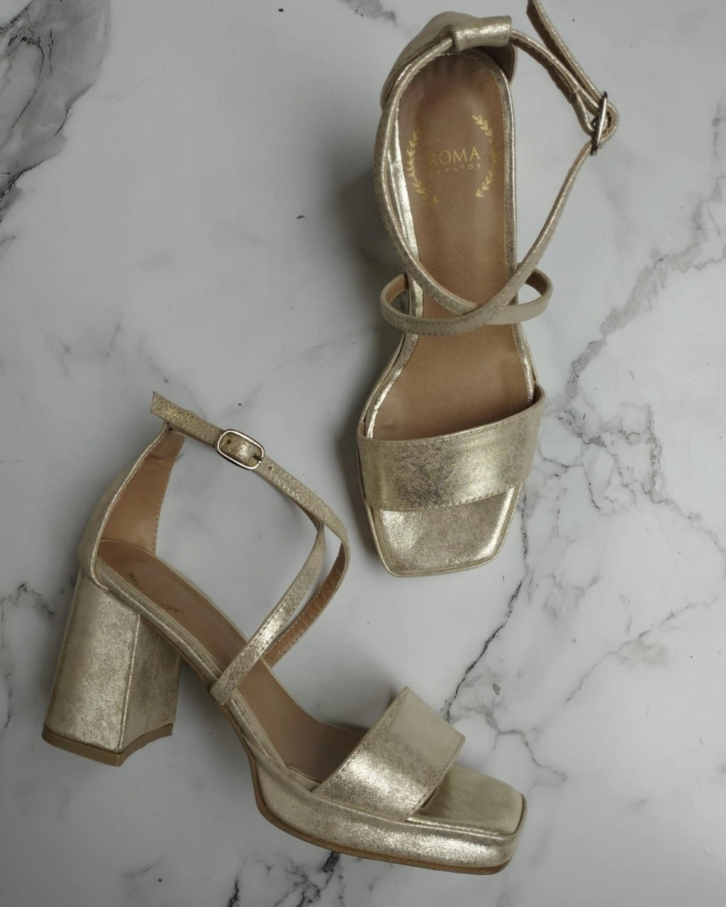 Sandalia de aproximadamente 8 cm de altura, confeccionada en Cuero Platino Machiatto.
